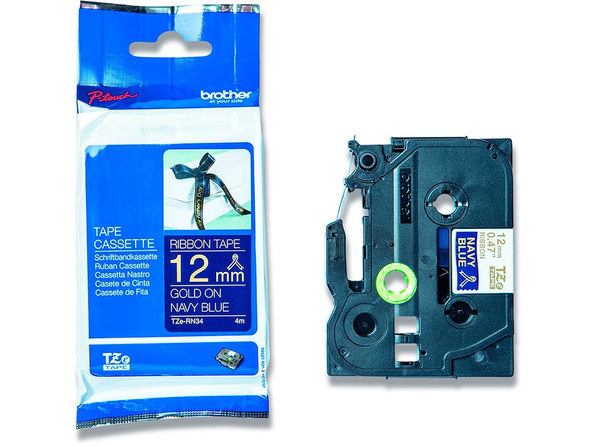 Labeltape, 12mm x 4m, Guld på Mørkeblå satin stofbånd, 1 rulle, Brother P-Touch TZe-RN34