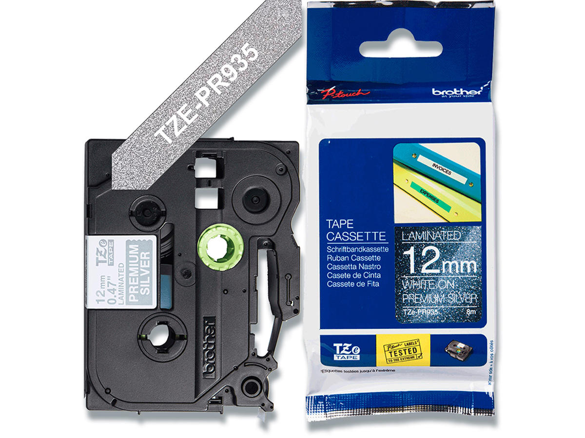 Labeltape, 12mm x 8m, Hvid på Sølv, 1 rulle, Brother P-Touch TZe-PR935