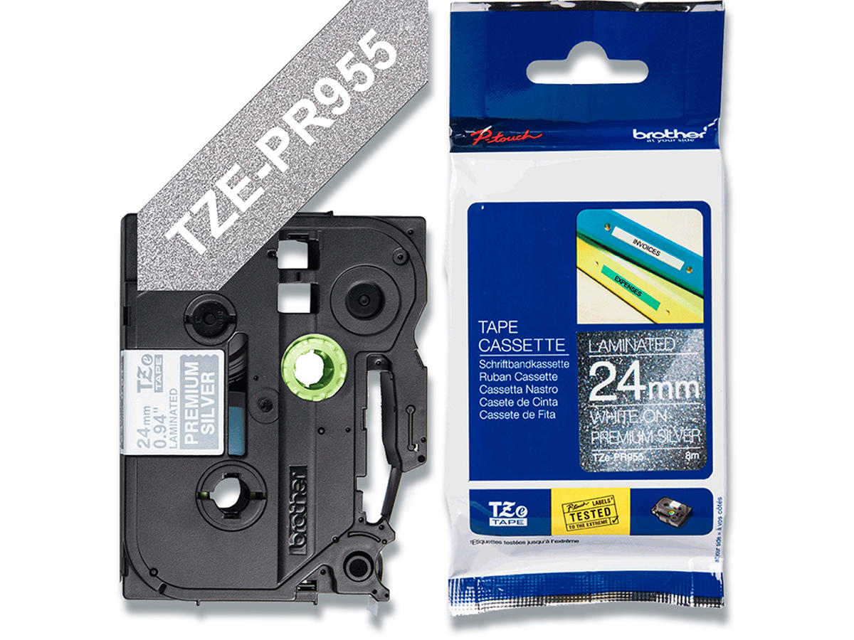 Labeltape, 24mm x 8m, Hvid på Sølv, 1 rulle, Brother P-Touch TZe-PR955
