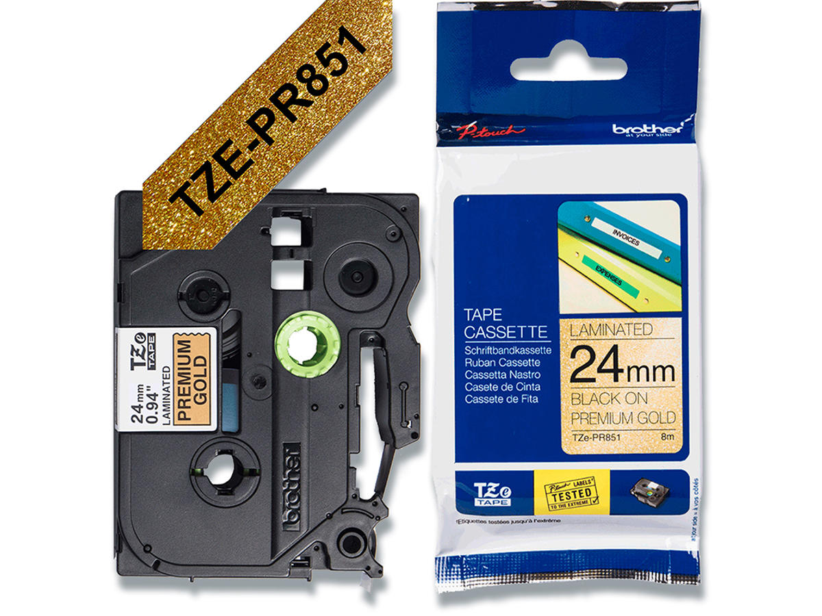 Labeltape, 24mm x 8m, Sort på Guld, 1 rulle, Brother P-Touch TZe-PR851