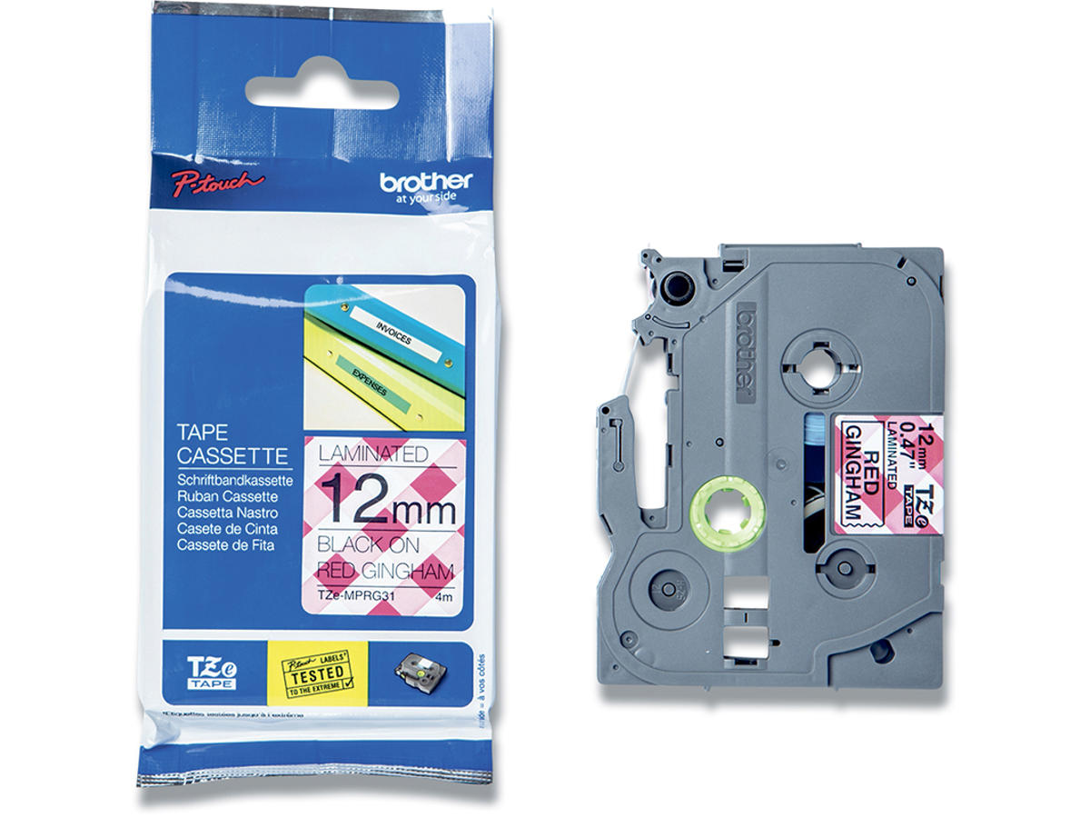 Labeltape, 12mm x 4m, Sort på Rød/hvid tern, 1 rulle, Brother P-Touch TZe-MPRG31