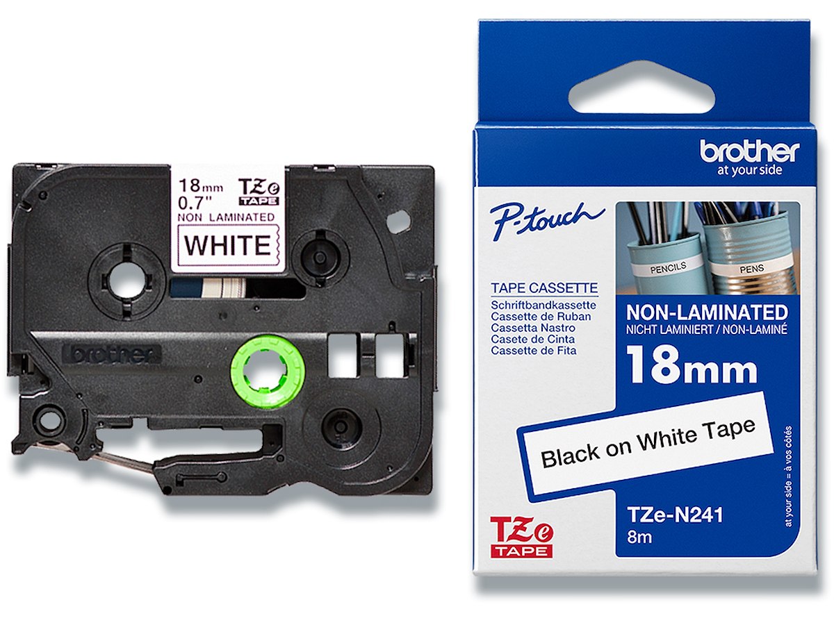 Labeltape, 18mm x 8m, Sort på Hvid, 1 rulle, Brother P-Touch TZe-N241