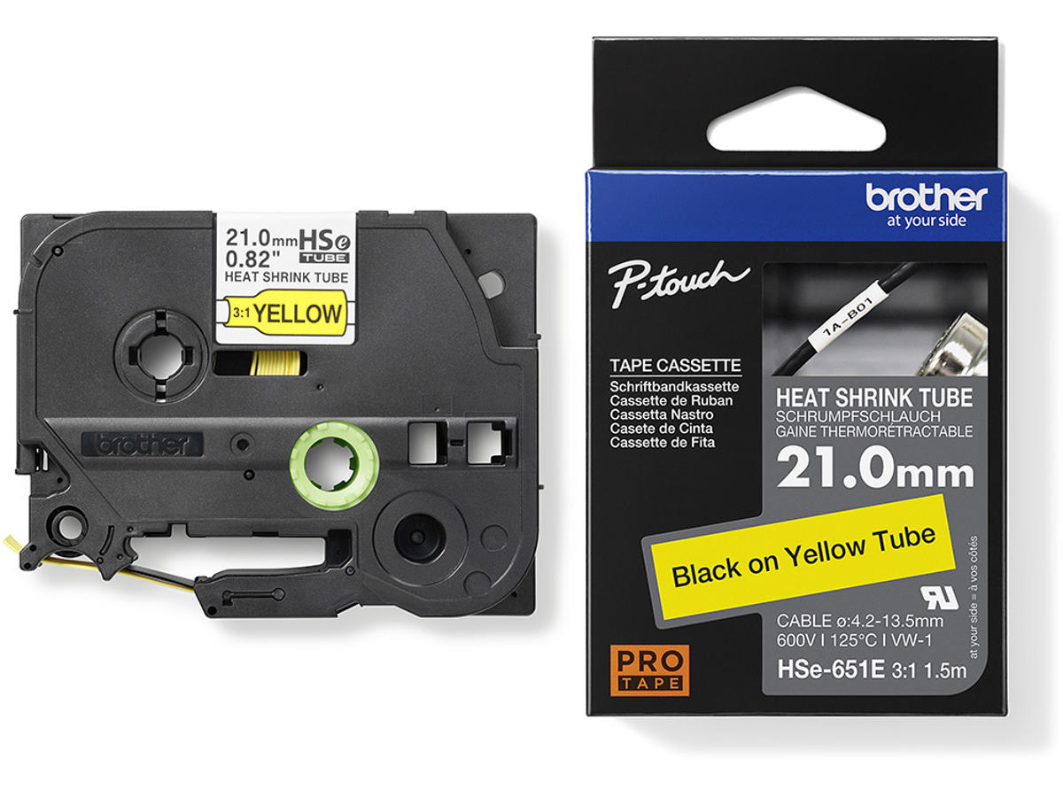 Labeltape, Krympeflex, 21.0mmx1.5m, Sort på Gul, Brother P-Touch HSe651E