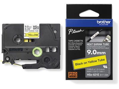Labeltape, Krympeflex, 9mm x 1.5m, Sort på Gul, Brother P-Touch HSe621E