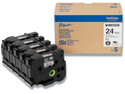 Labeltape, 24mm x 8m, Sort på Mat Sølv, 5 ruller, Brother P-Touch HGe-M951V5 Labeltape, 24mm x 8m, Sort på Mat Sølv, 5 ruller, Brother P-Touch HGe-M951V5