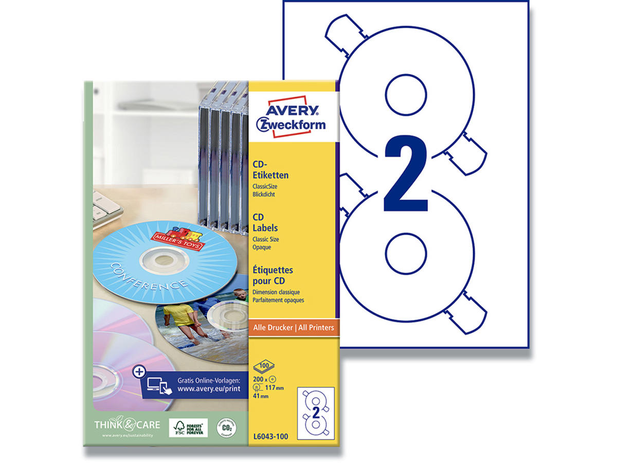 Har du taget en masse feriebilleder? Eller er den store fest blevet foreviget med et hav af digitalebilleder? Gem minderne på en CD, så bliver det også nemt at vise de mange billeder til familien, vennerne og kollegaerne - Eller give brudeparret dine billeder fra deres store dag. Med en printet CD etiket bliver det nemt og simpelt at se på hvilken CD der er gemt hvilke billeder. Avery’s L6043-100 hurtigtørrende CD etiketter til alle printere med 2 etiketter/ark og 200 etiketter/pk giver dine brændte CD’er et professionelt udseende og giver dig et hurtigt overblik over data, billeder, musik osv. Classic Size CD etiketter dækker hele overfladen af CD'en på nær den midterste gennemsigte del af CD'en og giver dine CD’er et klassisk udseende. Matchende CD omslag kan let designes og printes særskilt. Etiketterne er optimeret til brug på CD'ere, skal du bruge dem til DVD'ere henviser vi til full face DVD etiketter C9780-15. Du kan nemt og helt gratis designe og printe dine Avery produkter med vores software Avery Design & Print, hvor du finder skabeloner, grafik og designs - Klik her