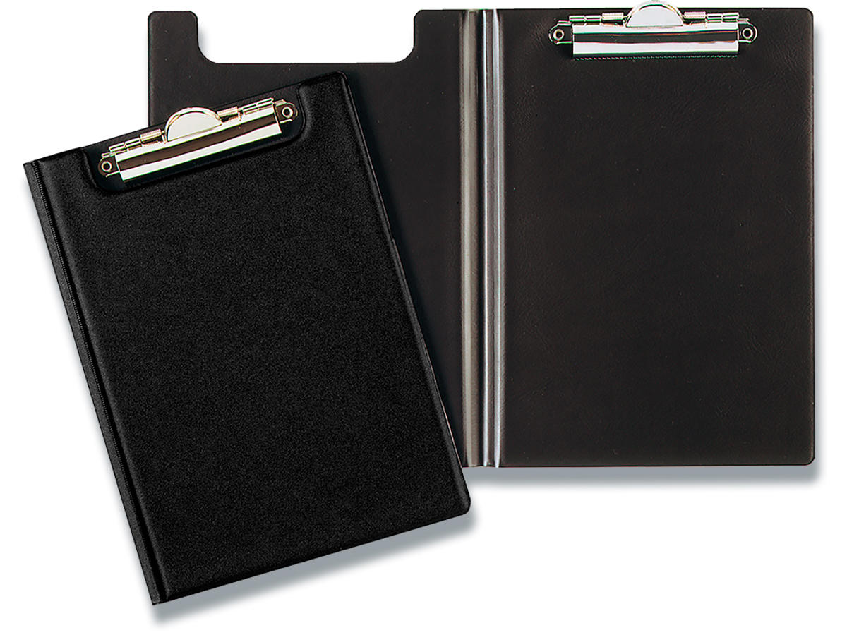 Dobbelt clipboard i A5 format. Kraftig klemme i toppen holder dokumenterne på plads. Skrålomme til opbevaring af løse papirer og dokumenter på indersiden af forsiden og en lomme til at sikre bagsiden af blok.
