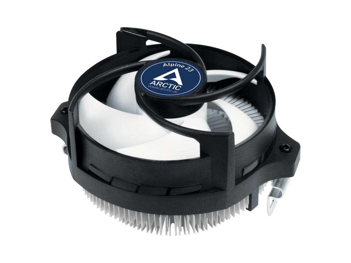 ARCTIC Alpine 23 - Compact AMD CPU-Cooler. Type: Luftkøler, Ventilator diameter: 9 cm, Omdrejningshastighed (min.): 100 rpm, Omdrejningshastighed (maks.): 2000 rpm, Støjniveau: 0,3 blæser, Lejetype: Fluid Dynamic Bearing (FDB). Spænding: 12 V. Bredde: 98,6 mm, Dybde: 121 mm, Højde: 65 mm. Produktfarve: Aluminium, Sort