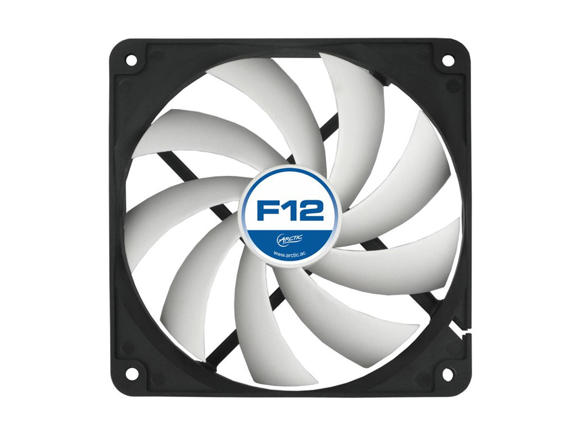 ARCTIC F12. Type: Ventilator, Ventilator diameter: 12 cm, Omdrejningshastighed (min.): 650 rpm, Omdrejningshastighed (maks.): 1350 rpm, Støjniveau: 0,3 blæser, Luftstrøm: 90,1 m³/t, Lejetype: Fluid Dynamic Bearing (FDB). Spænding: 12 V. Bredde: 120 mm, Dybde: 25 mm, Højde: 120 mm. Produktfarve: Sort, Hvid