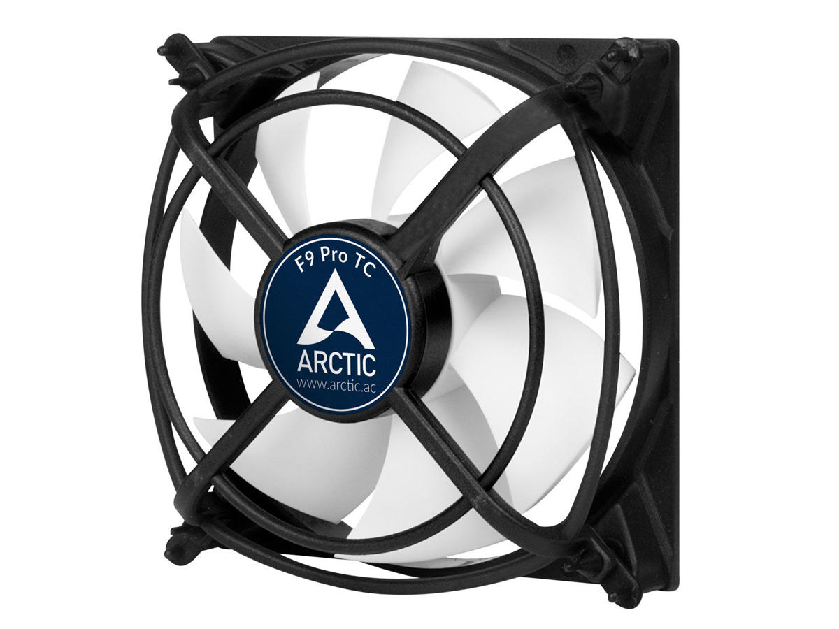 ARCTIC F9 Pro TC. Type: Ventilator, Ventilator diameter: 9,2 cm, Omdrejningshastighed (min.): 500 rpm, Omdrejningshastighed (maks.): 1800 rpm, Støjniveau: 0,4 blæser, Luftstrøm: 73,1 m³/t, Lejetype: Fluid Dynamic Bearing (FDB). Spænding: 12 V. Bredde: 92 mm, Dybde: 92 mm, Højde: 34 mm. Produktfarve: Sort, Hvid