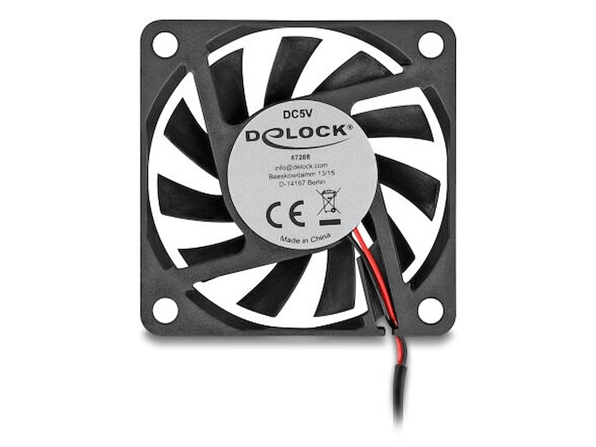 DeLOCK 67288. Type: Ventilator, Ventilator diameter: 6 cm, Luftstrøm: 0,38 m³/t, Lejetype: Kugleleje. Bredde: 60 mm, Dybde: 60 mm, Højde: 10 mm. Produktfarve: Sort