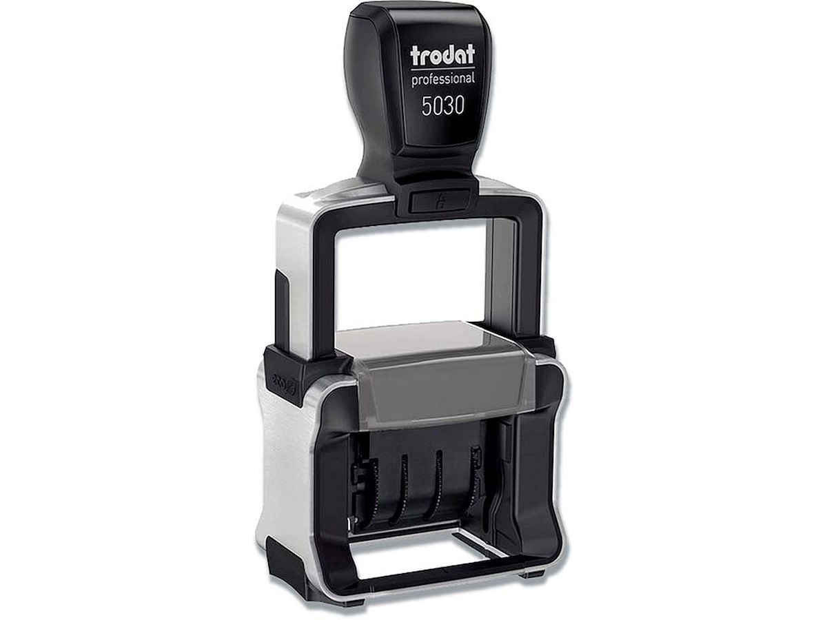 Et godt stabilt datostempel fremstillet af metal og med håndgreb i plast. Ved at trykke stemplet ned og klikke på siden af stemplet, skiftes datoen let uden at man kommer i berøring med farvepuden. Trodat datostempel viser dato, månedsangivelse (forkortet), samt årstal med 6 individuelle år med hvert årstal 2 gange.
