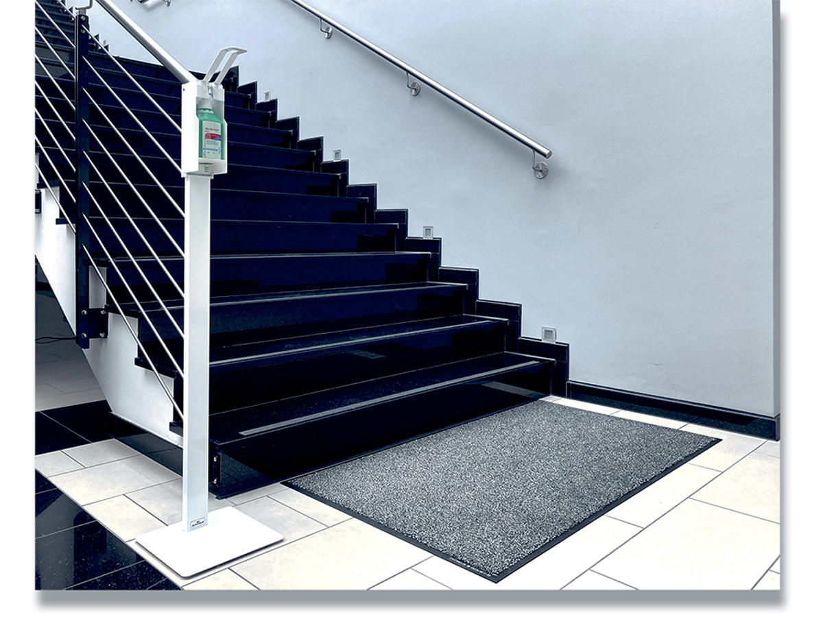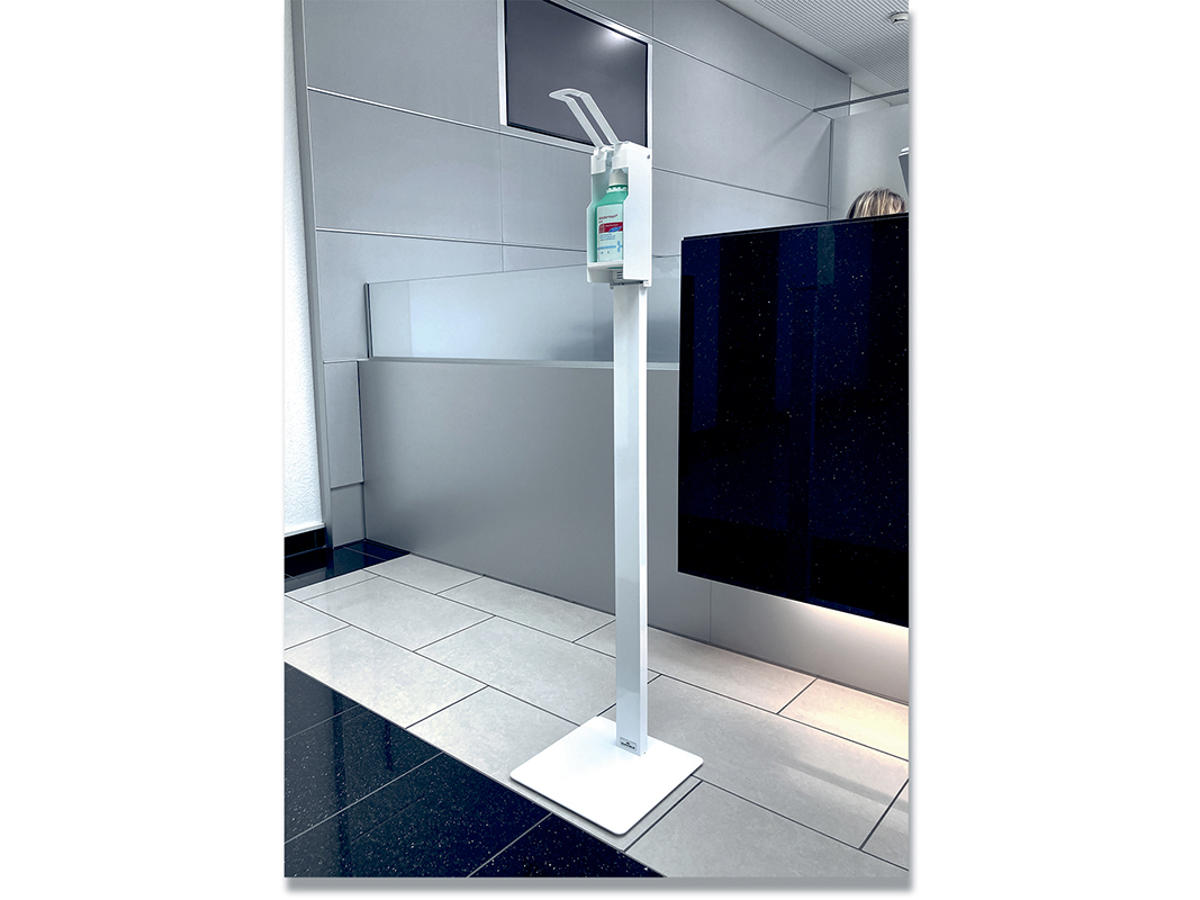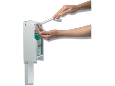 • Robust fritstående dispenser af høj kvalitet til desinfektionsmiddel eller flydende sæbe