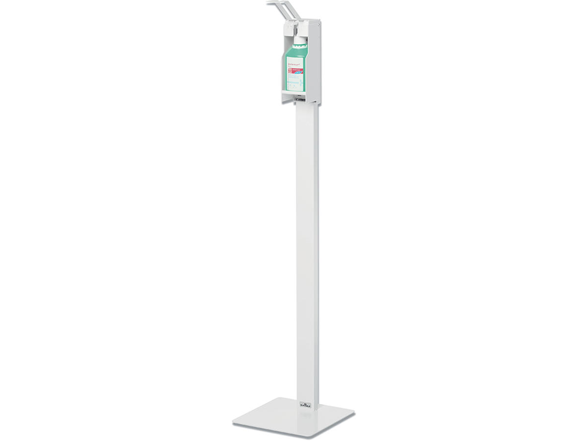 Fritstående, mobilt gulvstander med justerbar dispenser til håndsprit. Dispenseren er justerbar og passer til de fleste håndspritsflasker.