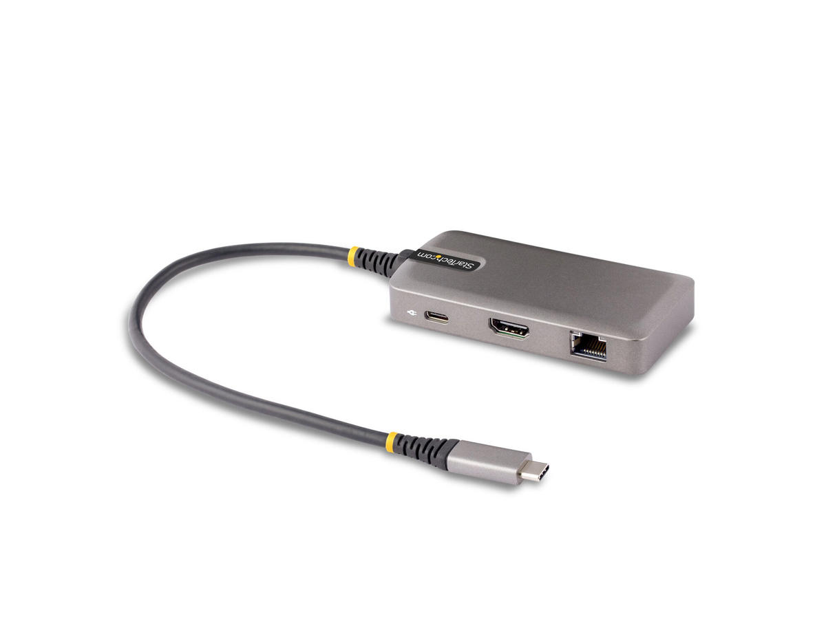 This Works With Chromebook (WWCB) certified USB-C Multiport Adapter supports up to 4K 60Hz HDMI 2.0b (HDR10) via DP Alt Mode. The USB-C dock converts a USB-C laptop or tablet, such as a Chromebook, Dell XPS, or a MacBook, into a workstation. The adapter connects to a host computer's USB-C, USB4, or Thunderbolt™ 3/4 port. It features one HDMI video output, a 2-Port USB 3.2 Gen 1 (5 Gbps) Hub, and Gigabit Ethernet. Connect a laptop USB-C power supply to the dedicated USB Power Delivery (PD) 3.0 port, located on the Multiport Adapter, to charge the laptop. The Multiport Adapter features an extra-long built-in 12-inch (30 cm) USB-C host cable.