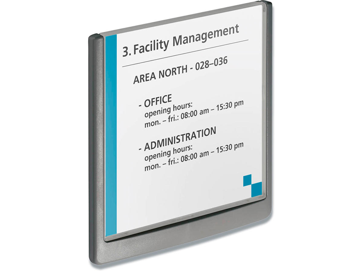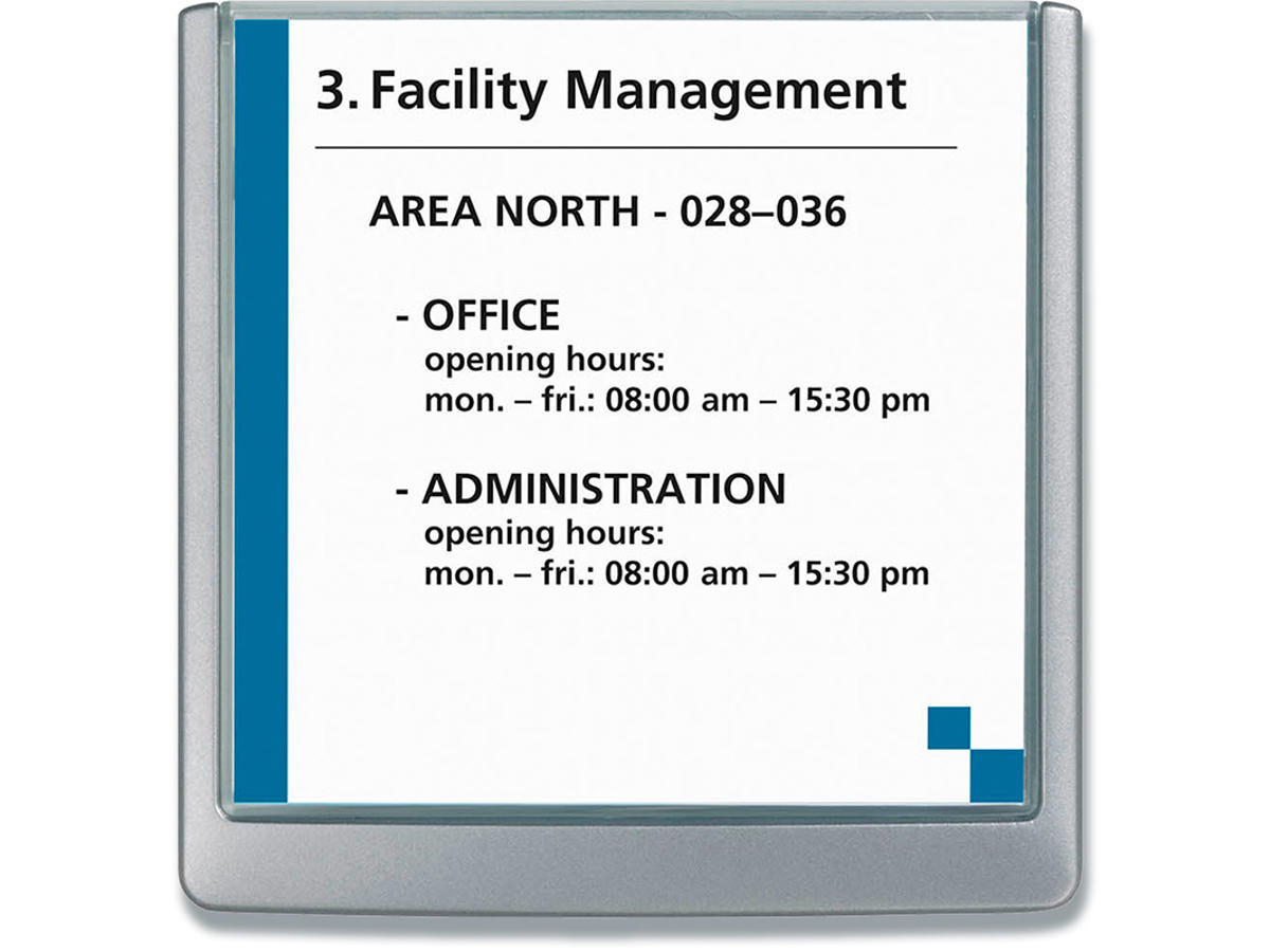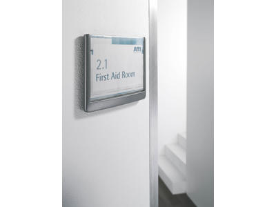 CLICK SIGN dør/vægskiltesystem med farvet kant og klar front. Let at udskifte indstik, blot løfte og sænke transparente frontpanel. Leveres med skruer, klæbepuder og neutralt indstiksark. Mål: 149x148,5mm. Ekstra indstiksark kan bestilles separat (Durable art nr DU4852-02) Design selv en personlig designet indstiksetiket til skiltet med gratis skabelon på Duraprint - Klik her