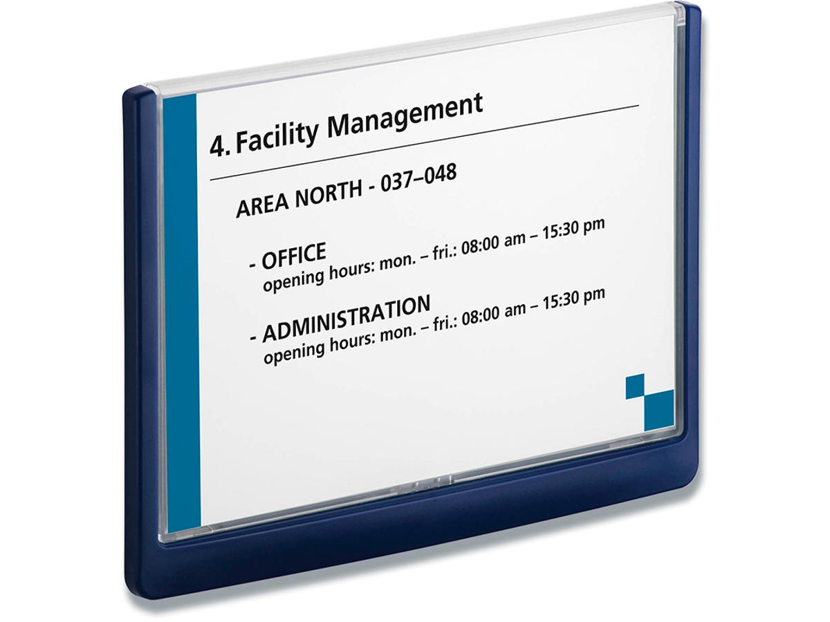 CLICK SIGN dør/vægskiltesystem med farvet kant og klar front. Let at udskifte indstik, blot løfte og sænke transparente frontpanel. Leveres med skruer, klæbepuder og neutralt indstiksark. Mål: 210x149 mm A5. Ekstra indstiksark kan bestilles separat (Durable art nr DU4855-02) Design selv en personlig designet indstiksetiket til skiltet med gratis skabelon på Duraprint - Klik her