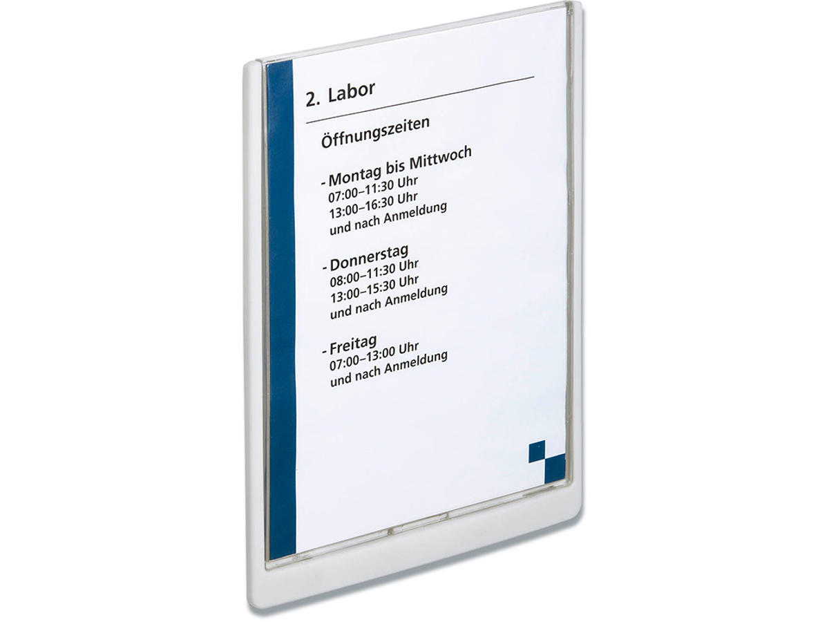 CLICK SIGN dør/vægskiltesystem med farvet kant og klar front. Let at udskifte indstik, blot løfte og sænke transparente frontpanel. Leveres med skruer, klæbepuder og neutralt indstiksark. Mål: 210x297mm A4. Ekstra indstiksark kan bestilles separat (Durable art nr DU4856-02) Design selv en personlig designet indstiksetiket til skiltet med gratis skabelon på Duraprint - Klik her