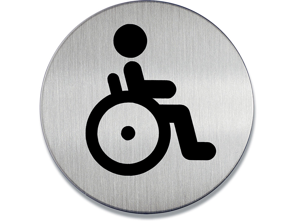 Rundt skilt "WC Handicap" af børstet rustfrit stål, der er ridsefri. Stort symbolskilt synlig på større afstand. Selvklæbende puder medfølger. Ø 83 mm