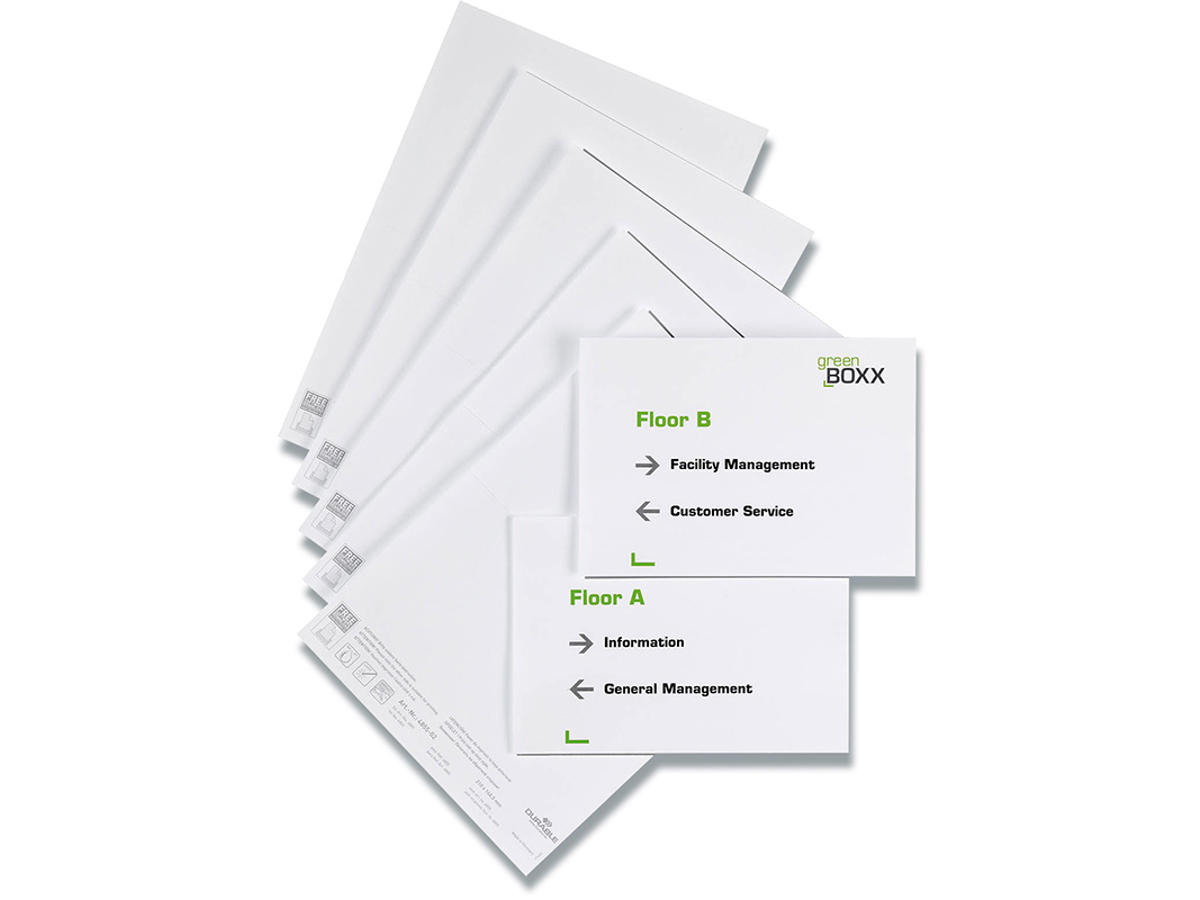 Hvid indstik på A4-ark til Durable dør/vægskilte INFO SIGN og CLICK SIGN og enkelte lagerlommer. Passer til varenr. DU4805-19 og DU4866 i forskellige farver. En pakke giver 10 skilte. Design selv en personlig designet indstiksetiket til skiltet med gratis skabelon på Duraprint - Klik her