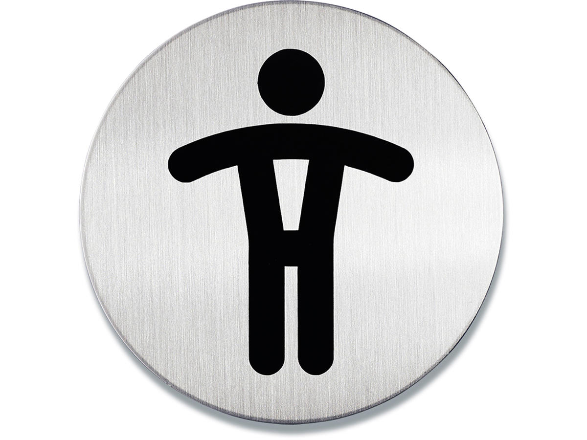 Rundt skilt "WC Herre" af børstet rustfrit stål, der er ridsefri. Stort symbolskilt synlig på større afstand. Selvklæbende puder medfølger. Ø 83 mm