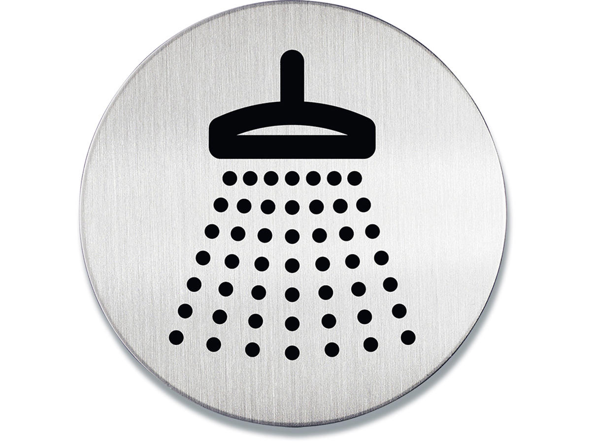 Rundt skilt "Brusebad" af børstet rustfrit stål, der er ridsefri. Stort symbolskilt synlig på større afstand. Selvklæbende puder medfølger. Ø 83 mm