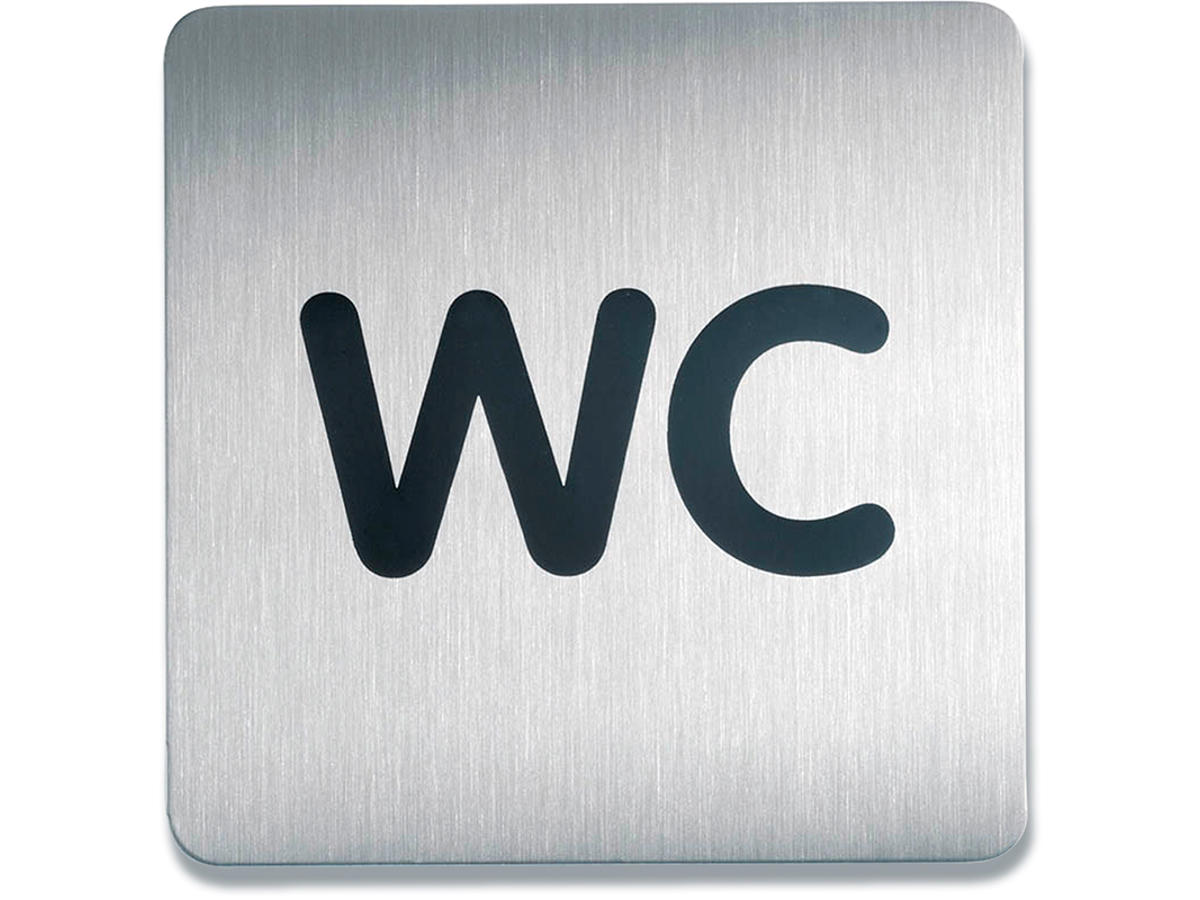 Firkantet skilt "WC" af børstet rustfrit stål, der er ridsefri. Stort symbolskilt synlig på større afstand. Selvklæbende puder medfølger. 150 x 150 mm