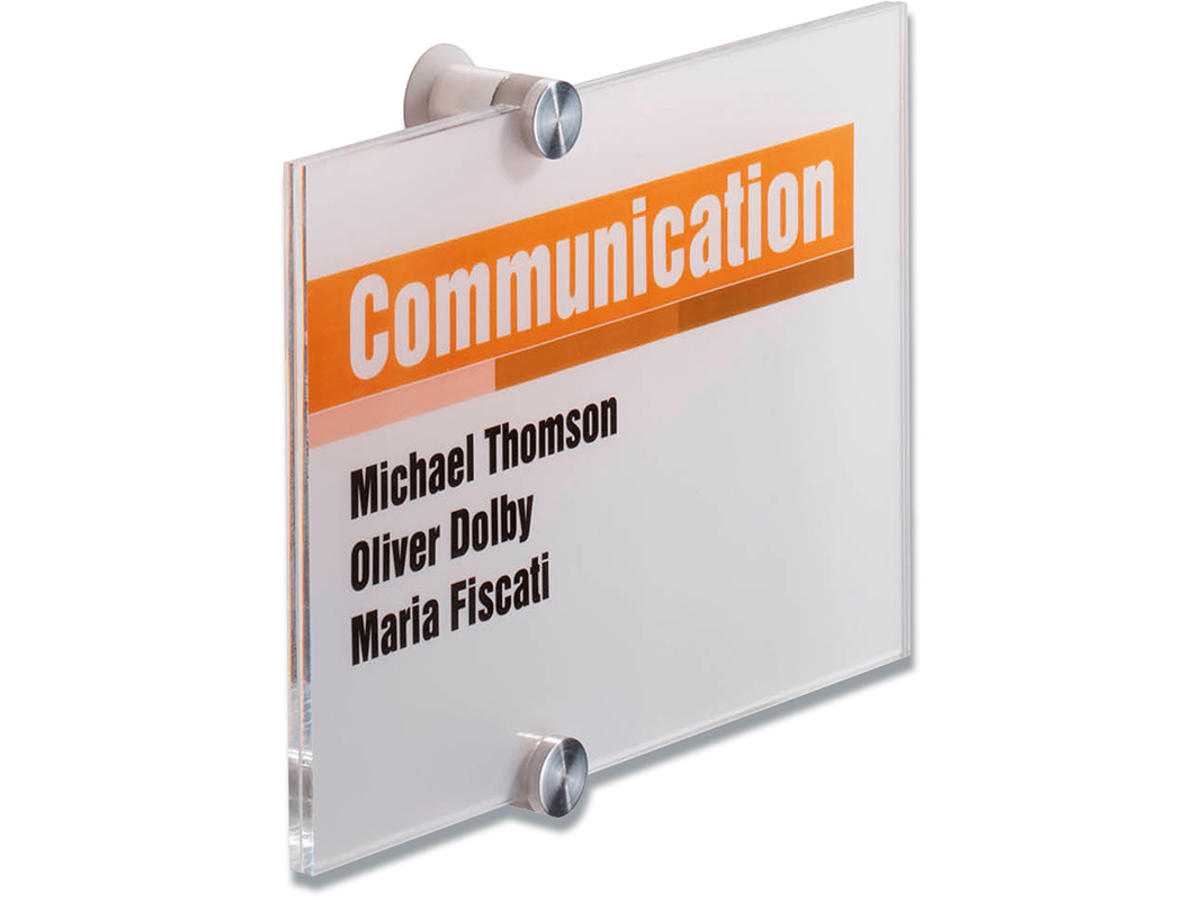 CRYSTAL SIGN dørskilt er en vellykket kombination af design og høj funktionalitet. Skiltet er udført i akrylplast som er sammensat af 2 stk dekorative skruer. Dørskiltet måler 210x148 mm. 2 stk. halvgennemsigtige indstiksark medfølger til hvert skilt, og disse kan nemt skrives ud på en laserprinter (ikke Blækprinter). Indstiksarket kan også bestilles separat (Durable art nr DU4833-19). Anvend DURAPRINT online som kan hjælpe med at fremstille en personlig designet indstiksetiket til skiltet - Klik her