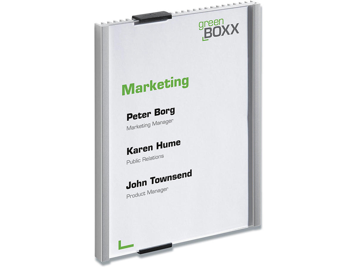 INFO SIGN er en serie i stilrent design som passer i de fleste miljøer. Dørskiltet er i aluminium og måler 149x210mm A5 høj. Med refleksfri frontplade i akryl. Leveres med skruer, klæbepuder og neutralt indstiksark. Ekstra indstiksark kan bestilles separat (Durable art nr DU4853-02) Anvend DURAPRINT online som kan hjælpe med at fremstille en personlig designet indstiksetiket til skiltet - Klik her