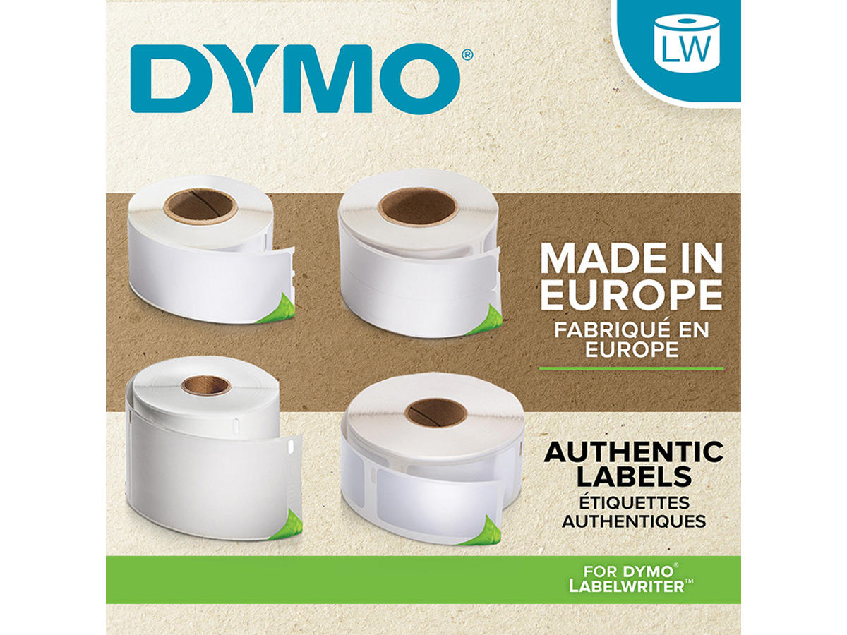 Dymo LabelWriter etiketter forhandles i mange forskellige størrelser og med aftagelig eller permanent lim.