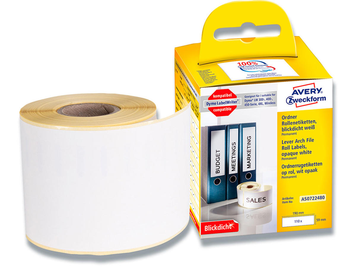 Med denne pakke får du Avery's velkendte kvalitetsetiketter til en meget attraktiv pris. I pakken får du 1 rulle med 110 etiketter 190 x 59 mm på. De er velegnede til brede ringbind og på mapper. Thermoetiketterne er kendetegnet ved en usædvanlig god klæbeevne og er fri for Bisphenol A (BPA). Etiketterne kan genanvendes sammen med almindeligt papiraffald. Du kan nemt og efter behov printe en eller flere etiketter ad gangen.