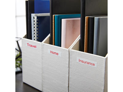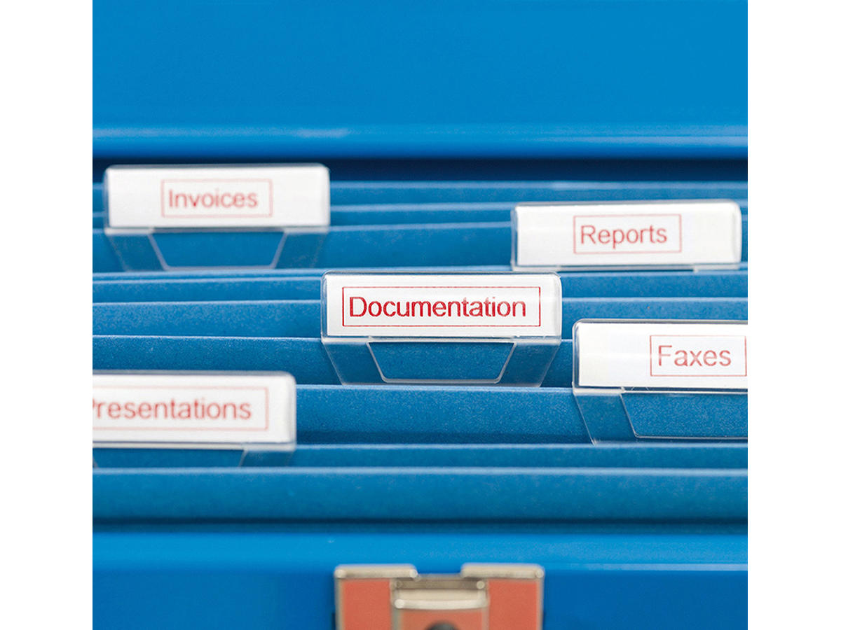 Dymo D1 fås i mange farver, både tape- og trykfarve, flere bredder og med aftagelig eller permanent lim.