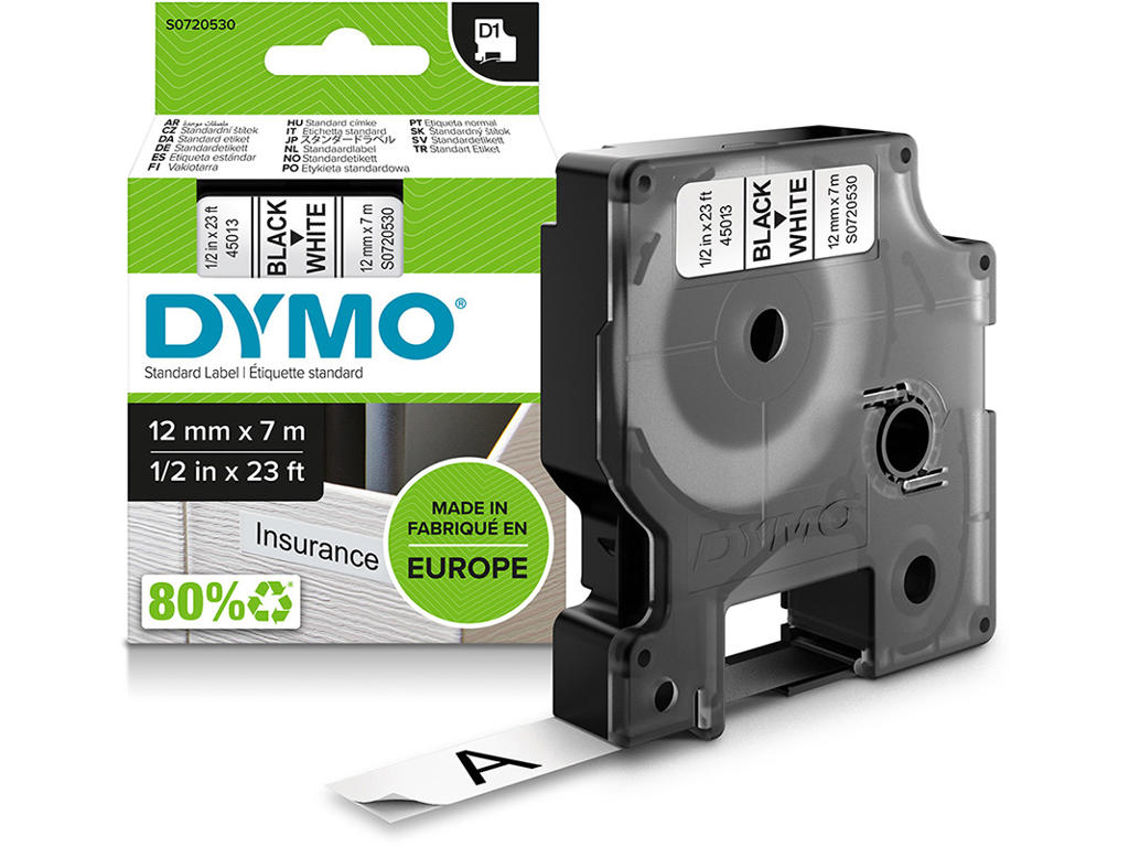 Labeltape, 12mm x 7m, Sort på Hvid, 1 rulle, Dymo D1 45013