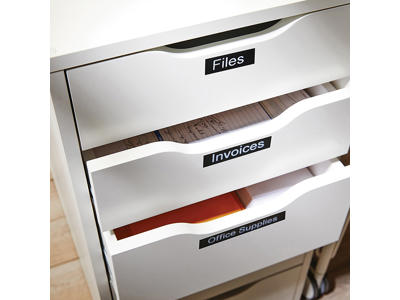 Dymo D1 fås i mange farver, både tape- og trykfarve, flere bredder og med aftagelig eller permanent lim.