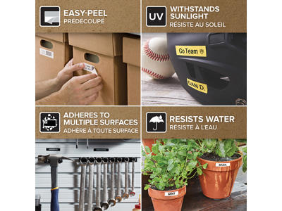 Dymo D1 klæber til rimelighed på strukturerede og buede overflader, som for eksempel computertasker, penne, el-apparater og computerkabinetter og modstår til rimelighed både vand, olie, fedt og solstråling.
