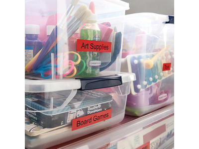Dymo D1 fås i mange farver, både tape- og trykfarve, flere bredder og med aftagelig eller permanent lim.
