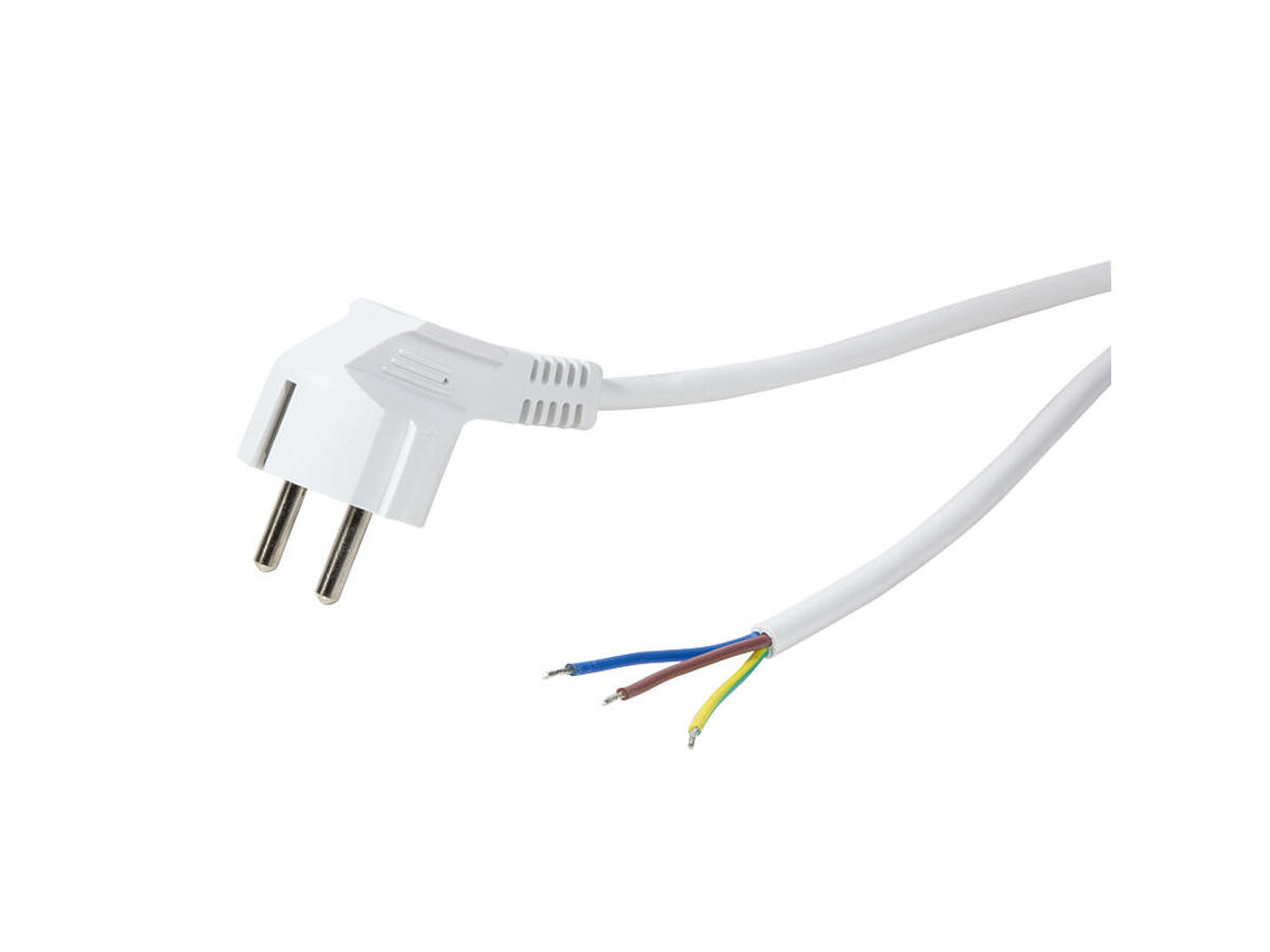 - plug 90° (Typ C CEE 7/7) to open wire with crimp barre- H05VV-F, 3x 0.75 mm2- 10A / 250V- Cable length: 1.5m- Color: White