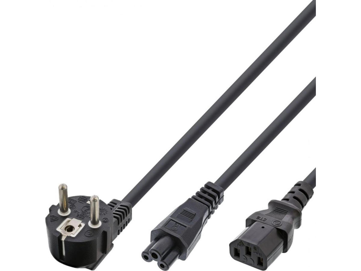 Connections: Schuko plug to 2 x IEC coupling, 1x C13 cold-plug coupling and 1x C5 (Mickey Mouse, for example for notebook power supply)