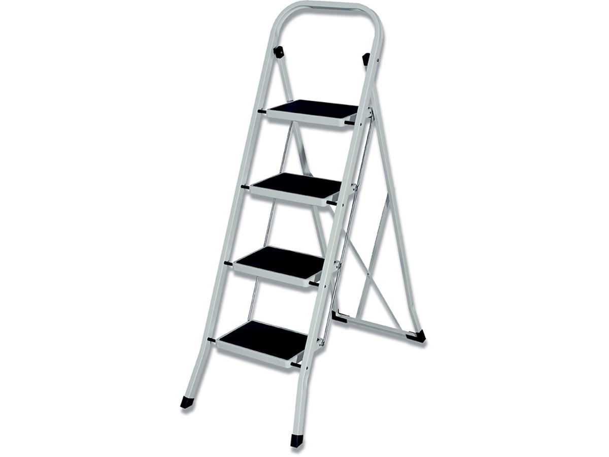 4 trins stål stige med brede trin og topbøjle. Anti-slip gummi fødder så stigen står sikkert og fast. Kan bruges til kontor og husholdning.