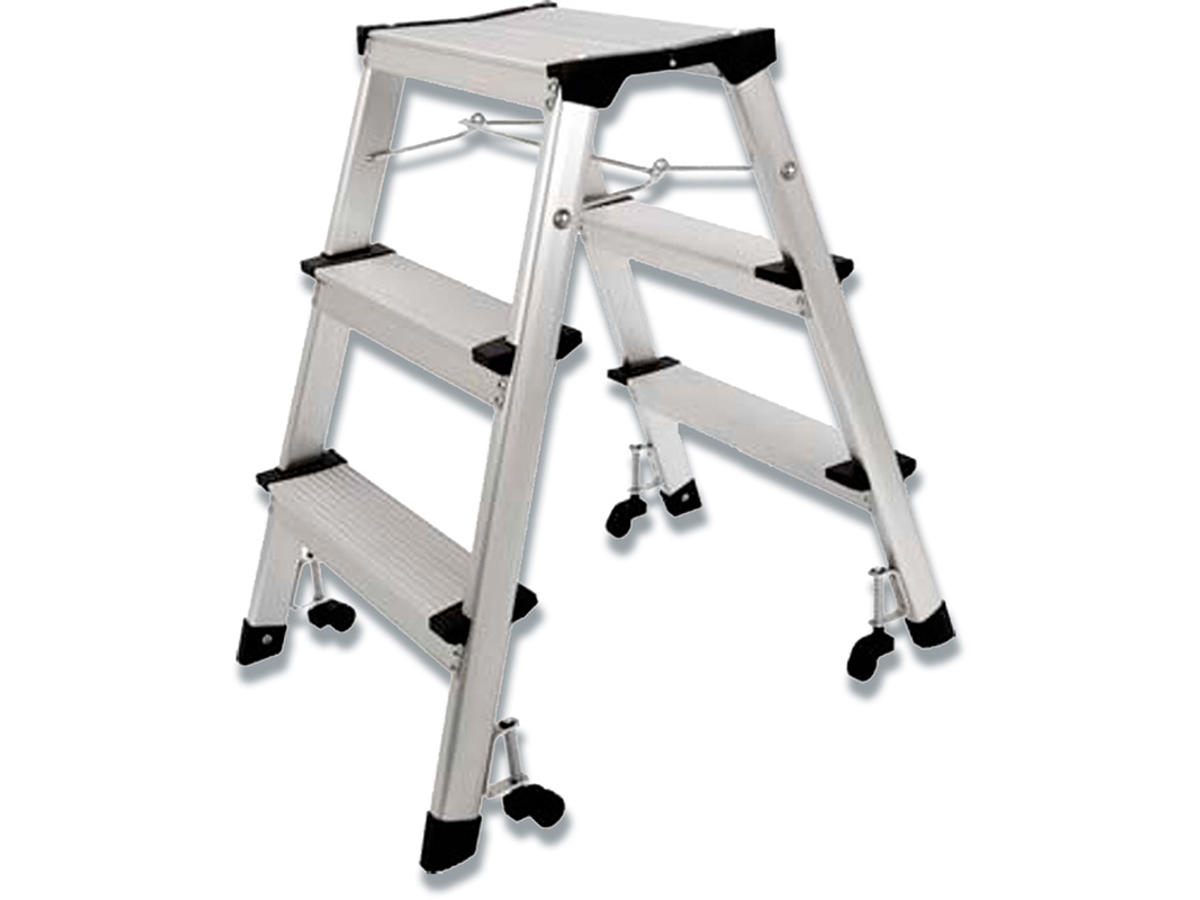 Stabil aluminium konstruktion. Mobil stige med 3 trin og 4 bevægelige hjul. Sammenklappelig, således at den ude af brug fylder minimalt. Belastning: 150 kg