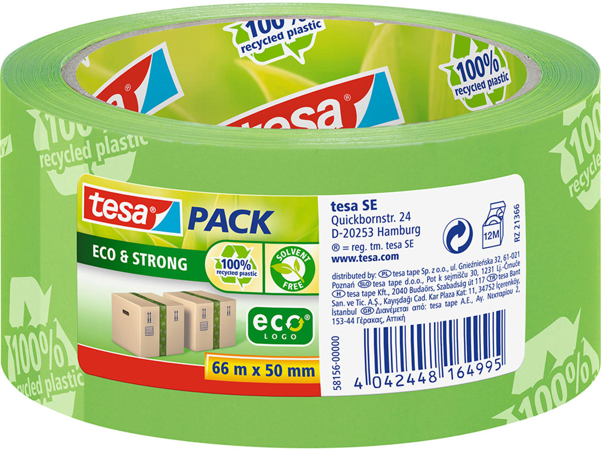 tesapack® emballagetape eco & strong er en pakketape, der er fremstillet af 100 % genbrugsplast og indeholder hverken pvc eller opløsningsmidler. Kernen er fremstillet af 100 % genbrugspap. Pakketapen er UV- og aldersbestandig og er med sin gode klæbeevne ideel til lukning af kartoner og kasser. Den er støjfri ved udrulning og kan bruges i alle tesapack®-dispensere. Nem og behagelig at arbejde med.