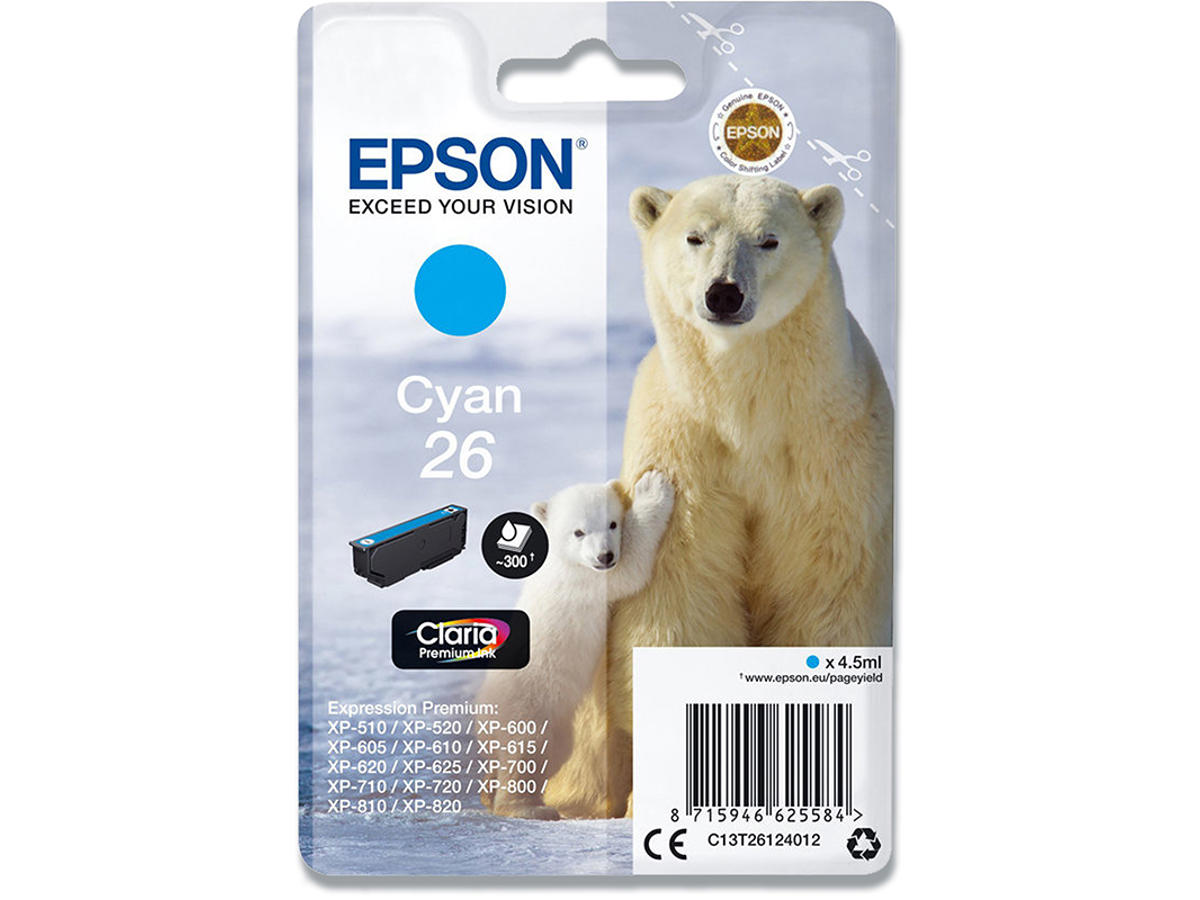 Blækpatron, 1 stk, 300 sider, Cyan-blå, Epson 26-T2612