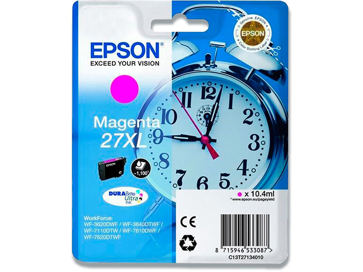 Blækpatron, 1 stk, 1.100 sider, Magenta-rød, Epson 27XL-T2713