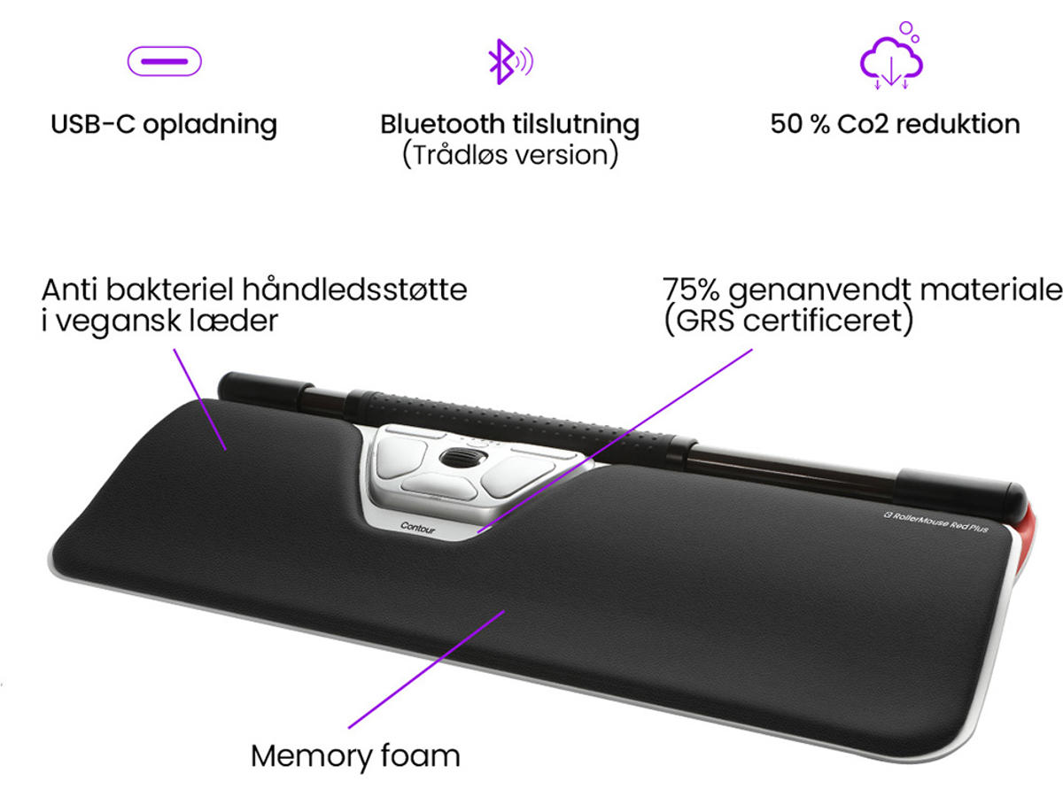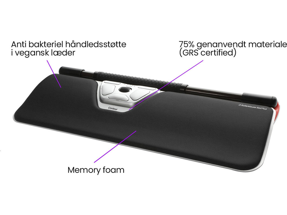 RollerMouse Red er tilpasset alle de funktioner du kan bruge på en computer i dag, og til alle størrelser af skærme. Rullestangen er placeret foran kroppen og sikrer musearbejde med minimale stræk og den centrerede arbejdsstilling beskytter mod ryg-, nakke-, og skuldersmerte hele dagen.