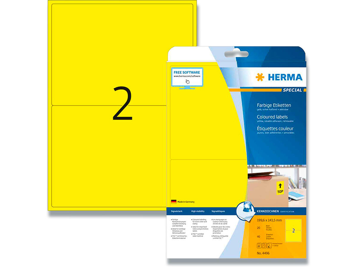 Flytbare, farvede labels på A4 ark. Ideelle til iøjenfaldende dokumentation, markedsføring, mærkning og logistik. Kan benyttes i blæk- og laserprintere samt kopimaskiner. 2 etiketter pr. ark, 20 ark i en pakke.