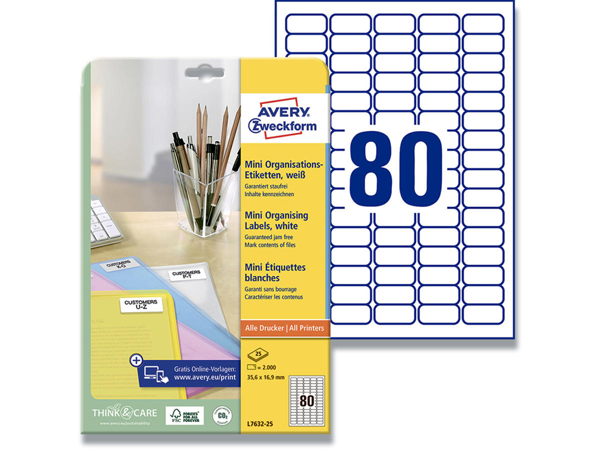 Har du et arkiv på kontoret eller til de vigtige papirer derhjemme? Med Avery's L7632-25 hvide mini-etiketter 35,6 x 16,9 mm til laser og inkjet printer med 80 etiketter/ark og 2000 etiketter/pk kan du hurtigt og nemt printe tekst, årstal, tal, arkiv-bogstaver eller hvad du måtte have brug for i dit arkiv og klæbe på dine hængemapper, skuffer eller hylder for nemt at organiserer papirerne, og dermed også nemt kunne finde dem frem igen hvis det bliver nødvendigt. De er også velegnede som returetiketter til dine postforsendelser. Kan printes i alle s/h- og laserprintere, samt inkjetprintere, og JamFree garantien sørger for at du ikke skal bekymre dig om printer stop når du printer. Du kan nemt og helt gratis designe og printe dine Avery produkter med vores software Avery Design & Print, hvor du finder skabeloner, grafik og designs - Klik her