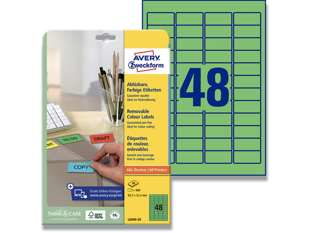 Farvede aftagelige etiketter er nemmere at få øje på. Når der er mange forskellige projekter i gang kan det være svært at holde styr på hvilke opgaver der haster mest. Hvis du farvekoder opgaverne med Avery's L6038-20 aftagelige grønne etiketter med 48 etiketter/ark og 960 etiketter/pakke kan hele teamet nemt få overblik over de opgaver der ligger. Du kan f.eks. bruge de røde etiketter til at mærke de opgaver der haster og skal løses i denne uge, og de grønne til de opgaver der kan vente lidt. Eller du kan farvekode opgaverne efter hvilket projekt de høre under, det er helt op til dig – Du vælger blot det system der passer bedst til dig og dit team. Etiketterne er aftagelige, og kan nemt fjernes uden at efterlade limrester, hvilket gør dem perfekte til midlertidig mærkning. Kan printes i alle printere, og Avery's JamFREE™ garanti sikrer at du ikke behøver bekymre dig om etiketterne sidder fast i printeren og giver printerstop. Du kan nemt og helt gratis designe og printe dine Avery produkter med vores software Avery Design & Print, hvor du finder skabeloner, grafik og designs - Klik her