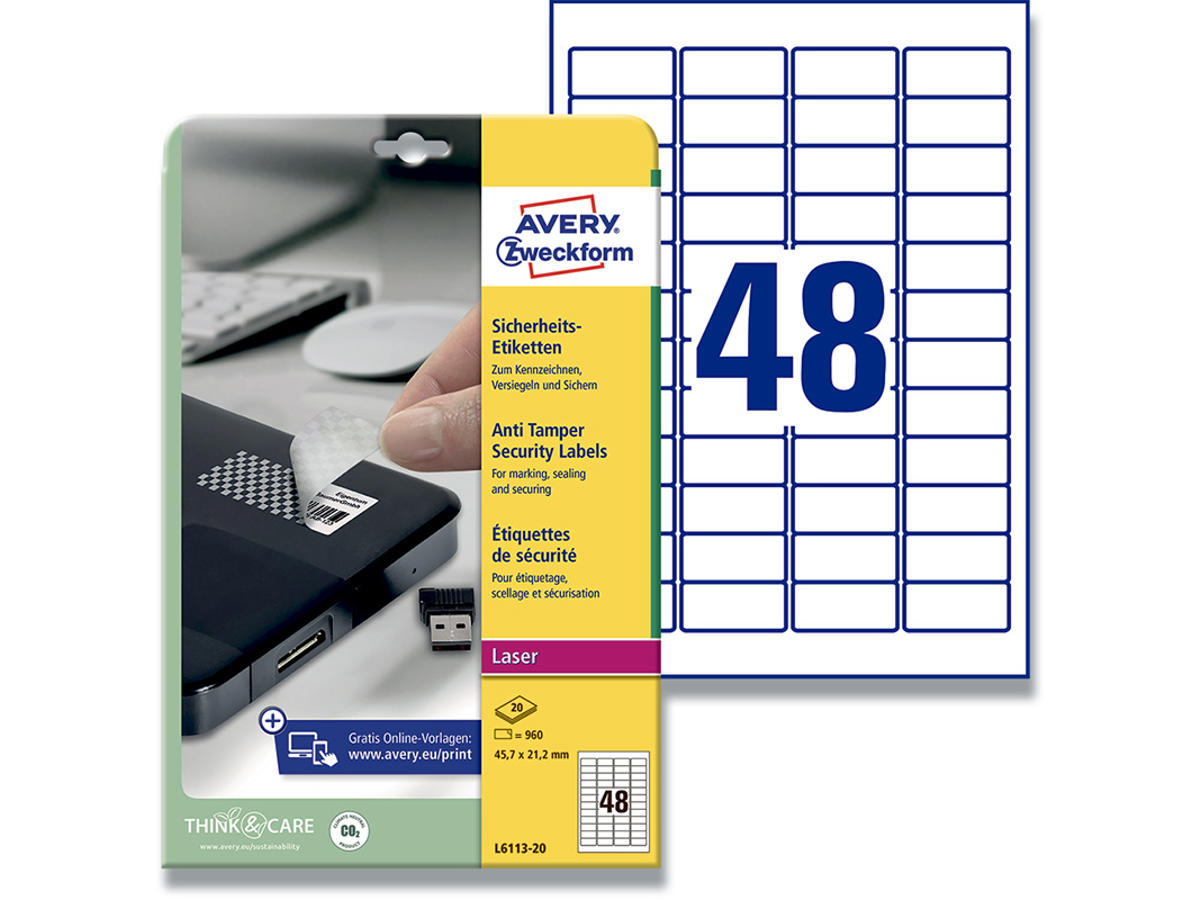 Avery’s plomberingsetiketter der efterlader et mønster er det perfekte valg, hvis du nemt og effektivt vil tyverimærke dit håndværktøj, mobile enheder eller andre værdigenstande med navn, firma og øvrige kontaktoplysninger, så de let kan identificeres og spores, hvis uheldet skulle være ude, og genstandene stjæles eller på anden vis bliver væk. Etiketterne er lavet i et polyestermateriale, som efterlader et mønster, når de fjernes og et hvert forsøg på manipulation vil være åbenlys. Det være umiddelbart indlysende for politi, ved eventuelt videresalg eller for dig selv, hvis nogen har forsøg at pille disse sikre etiketter af eller bryde forseglingen. Udover plomberingsegenskaben er de desuden modstandsdygtige overfor olie, smuds, vand og UV-stråler og tåler temperaturer fra -40 til +80 °C. De klæber på metal, glas, papir og plastik mm. Det gør dem særdeles velegnede også til brug udendørs på f.eks. værktøj. Avery's L6113-20 plomberingsetiketter har 48 etiketter/ark og 960 etiketter/pk, hvor hver etiket måler 45,7 x 21,2 mm. Etiketternes størrelse er velegnet til f.eks. at mærke håndværktøj, mobile enheder, som tablets, iPads og værdigenstande i hjemmet, som smykkeæsker, malerier, mindre boliginteriør mv. Etiketterne er også ideelle til at plombere vigtige breve, dokumenter og skrivelser, hvor det er vigtigt at kunne se, om skrivelsen er blevet læst af uvedkommende. Etiketterne kan printes i alle s/h laserprintere. Den maksimale klæbeevne opnås først efter et døgn. Du kan nemt og helt gratis designe og printe dine Avery produkter med vores software Avery Design & Print, hvor du finder skabeloner, grafik og designs - Klik her