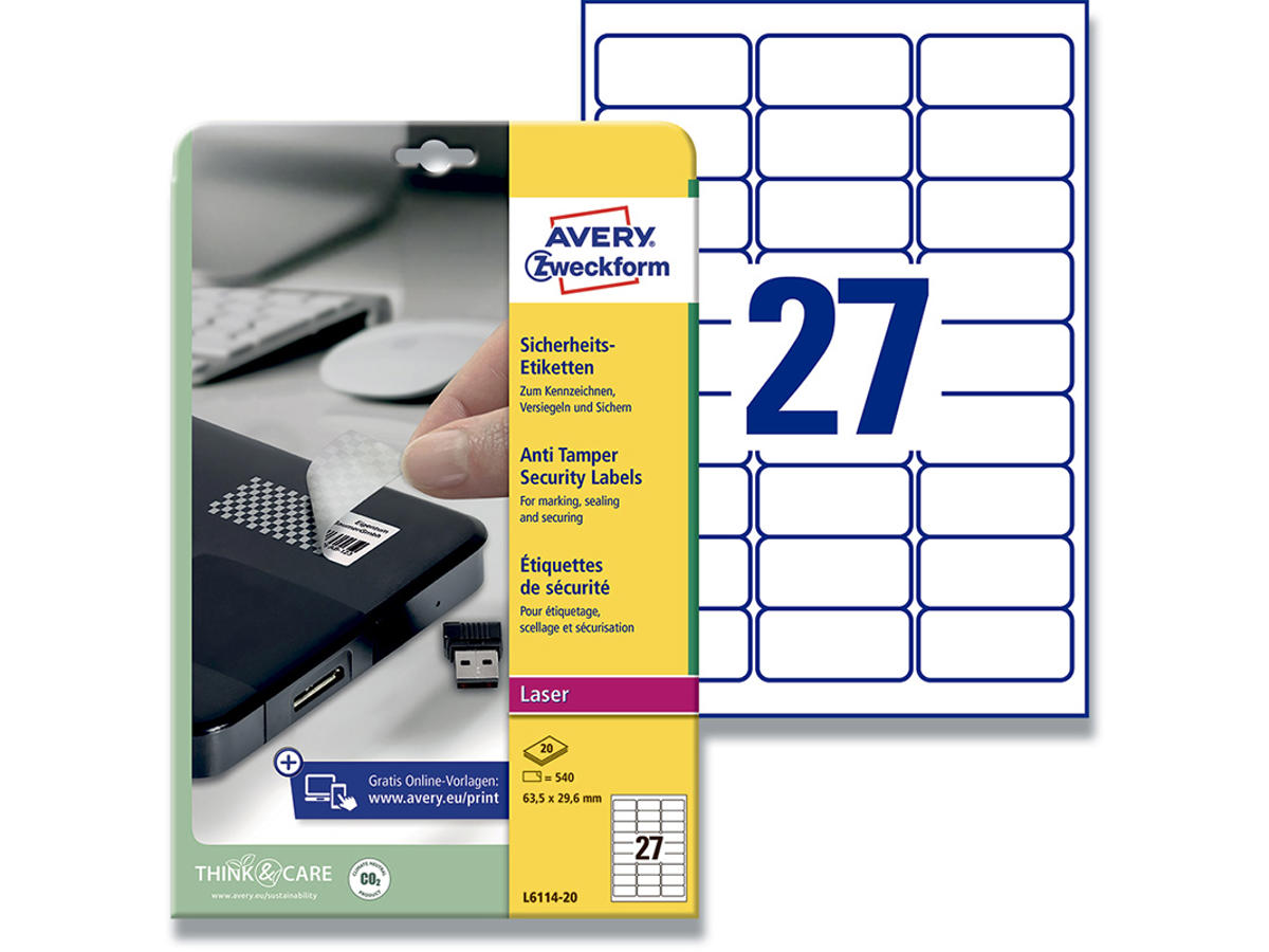 Avery’s plomberingsetiketter der efterlader et mønster er det perfekte valg, hvis du nemt og effektivt vil tyverimærke dit håndværktøj, mobile enheder eller andre værdigenstande med navn, firma og øvrige kontaktoplysninger, så de let kan identificeres og spores, hvis uheldet skulle være ude, og genstandene stjæles eller på anden vis bliver væk. Etiketterne er lavet i et polyestermateriale, som efterlader et ternet mønster, når de fjernes og et hvert forsøg på manipulation vil være åbenlys. Det være umiddelbart indlysende for politi, ved eventuelt videresalg eller for dig selv, hvis nogen har forsøg at pille disse sikre etiketter af eller bryde forseglingen. Udover plomberingsegenskaben er de desuden modstandsdygtige overfor olie, smuds, vand og UV-stråler og tåler temperaturer fra -40 til +80 °C. De klæber på metal, glas, papir og plastik mm. Det gør dem særdeles velegnede også til brug udendørs på f.eks. værktøj. Avery's L6114-20 plomberingsetiketter har 27 etiketter/ark og 540 etiketter/pk, hvor hver etiket måler 63,5 x 29,6 mm. Etiketternes størrelse er velegnet til f.eks. at mærke håndværktøj, mobile enheder, som tablets, iPads og værdigenstande i hjemmet, som smykkeæsker, malerier, mindre boliginteriør mv. Etiketterne er også ideelle til at plombere vigtige breve, dokumenter og skrivelser, hvor det er vigtigt at kunne se, om skrivelsen er blevet læst af uvedkommende. Etiketterne kan printes i alle s/h laserprintere. Den maksimale klæbeevne opnås først efter et døgn. Du kan nemt og helt gratis designe og printe dine Avery produkter med vores software Avery Design & Print, hvor du finder skabeloner, grafik og designs - Klik her
