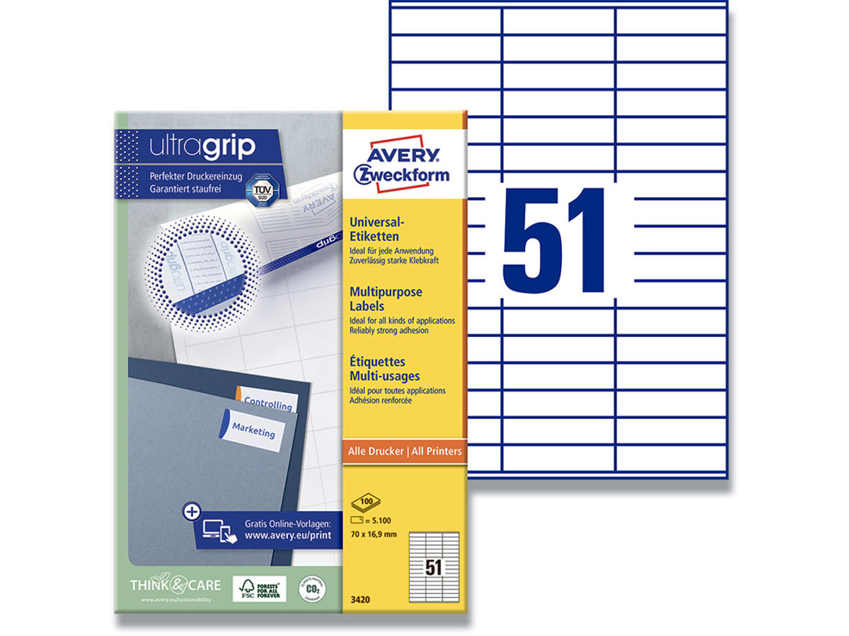 Har du flere forskellige typer printere på kontoret? Intet problem, du behøver kun købe én slags etiketter, for med Avery&rsquos hvide 3420 Universaletiketter med Ultragrip til indendørsbrug med 51 etiketter/ark og 5100 etiketter/pk, får du etiketter der kan bruges til både s/h- og farvelaserprintere, inkjetprintere samt kopimaskiner. Så behøver du ikke længere bekymre dig om du har lagt etiketterne til Inkjetprinteren i Laserprinteren.